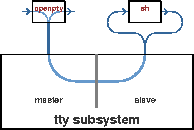 La situazione risultante è quella rappresentata in figura 1, in cui le frecce entranti e uscenti dai processi rappresentano i file standard di input e output mentre la riga blu uscente da openpty rappresenta il file aperto verso il terminale master. Poiché però standard input e output di openpty staranno probabilmente girando all'interno di un altro terminale (la console, xterm o, come nel mio caso, rshd -- a sua volta controllato da rsh dentro ad un xterm), occorre configurare il terminale ospite per permettere l'uso interattivo (un carattere alla volta) dell'interprete di comandi invocato nel nuovo terminale slave; a questo fine è stato usato il comando stty presentato precedentemente.