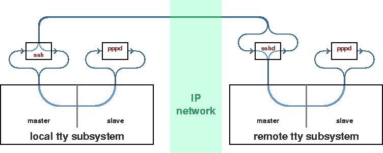 Ma se PPP può lavorare su qualsiasi terminale, allora è possibile fare un collegamento IP punto-punto tra due macchine remote, a patto di poter creare una coppia di terminali in ognuna di esse. In figura 2 è rappresentato il modo per realizzare tale collegamento instradando il protocollo dentro un canale ssh, invece che su una porta seriale come normalmente si fa con PPP. Ognuno dei due pppd viene fatto comunicare con un terminale slave, che per il software è indistinguibile da un modem, e i due processi ssh, client e server, si occupano di fare da ponte tra il terminale master e il canale cifrato su protocollo IP.