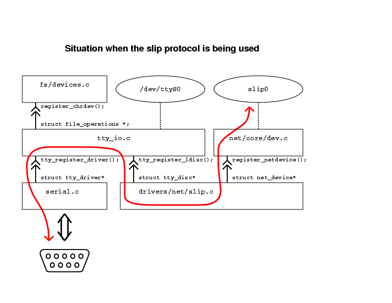 Whenever you dial your modem with ppp to connect to the Internet, or use the simpler slip communication protocol to connect the PC to your Linux palm-top, you are exploiting the complexity just shown. Both ppp and slip implement their own line discipline; when either of them is run, the tty device is switched to a different line discipline in order to detach /dev/ttyS0 from the serial port and keep all of serial communication within the kernel.
