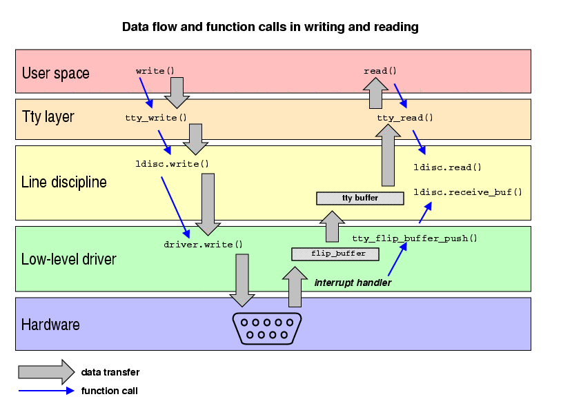 Figure 3 visualizes how data flows from user space down to hardware interfaces and backwards. It refers to the specific case of a standard PC serial port with the default line discipline attached. The logical stacking of line disciplines (near to user space) and tty drivers (near to the hardware itself) should be apparent.